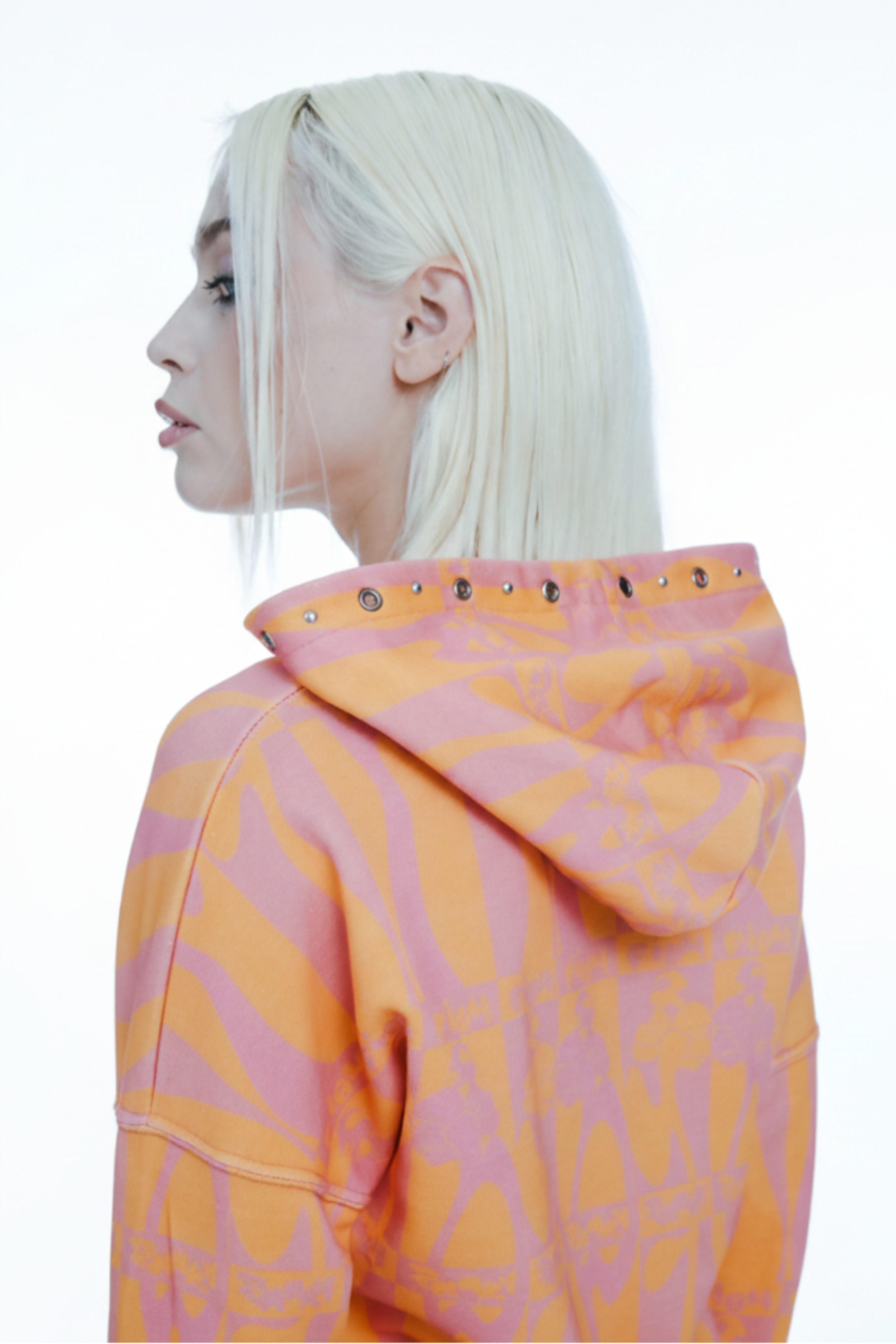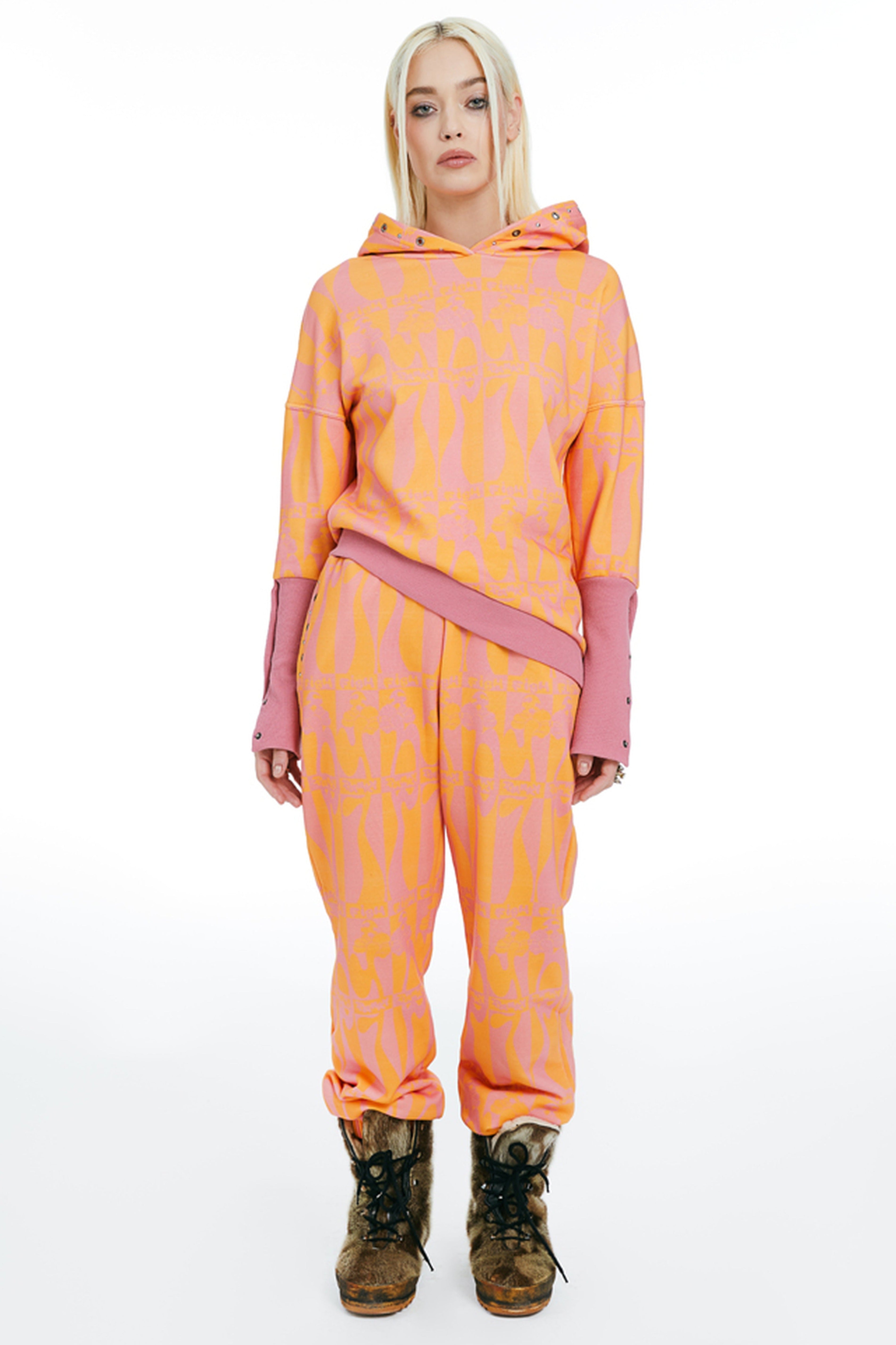 Get your co-ord game on with this hooded sweatshirt and jogger set. Featuring an oversized fit and allover pattern, it's perfect for casual days. The sweatshirt boasts dropped shoulders, a front pouch pocket, and ribbed cuffs, while the joggers have a high-rise waist, side seam pockets, and metallic details. Stay comfy and stylish in this unique set!