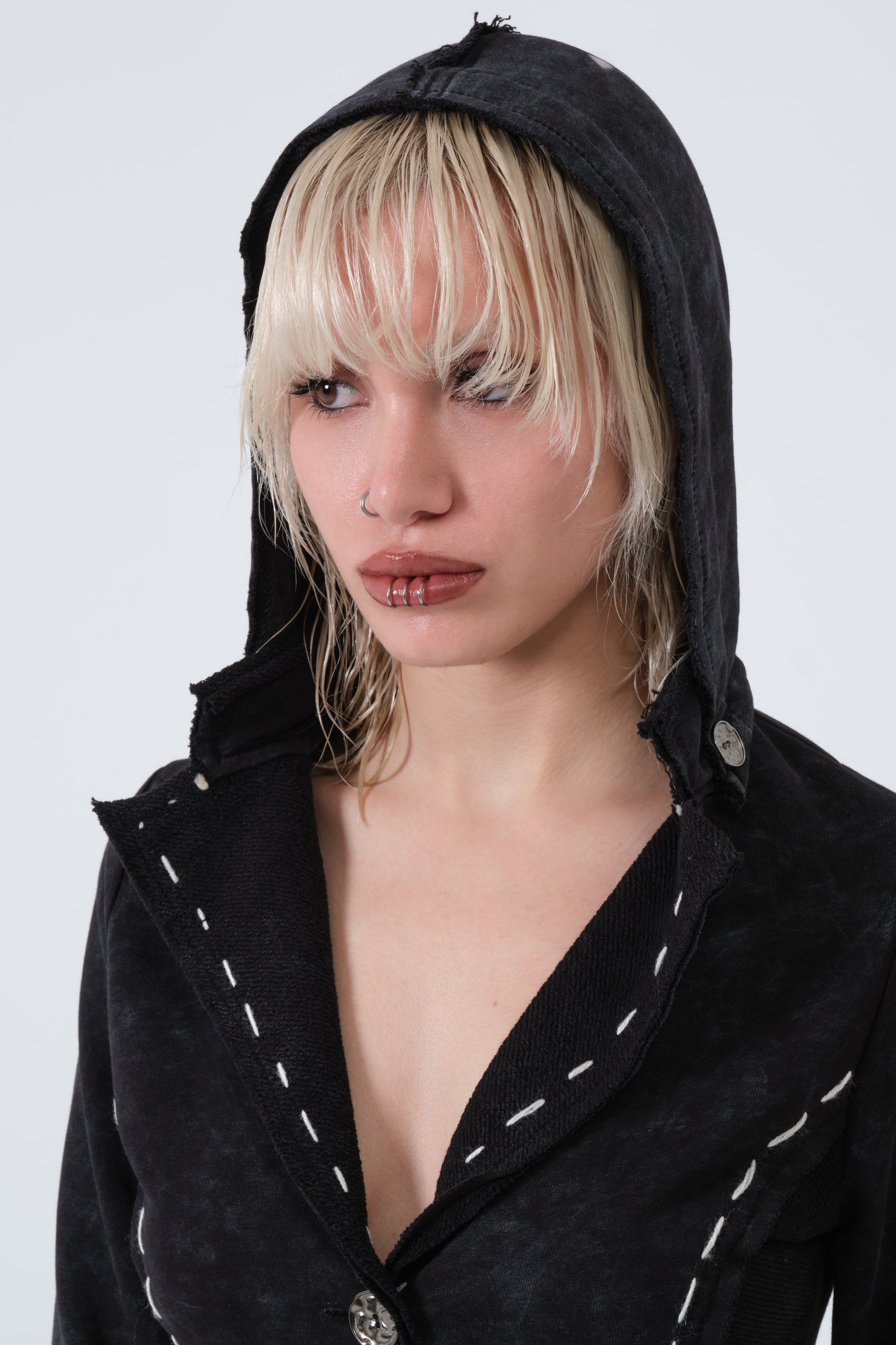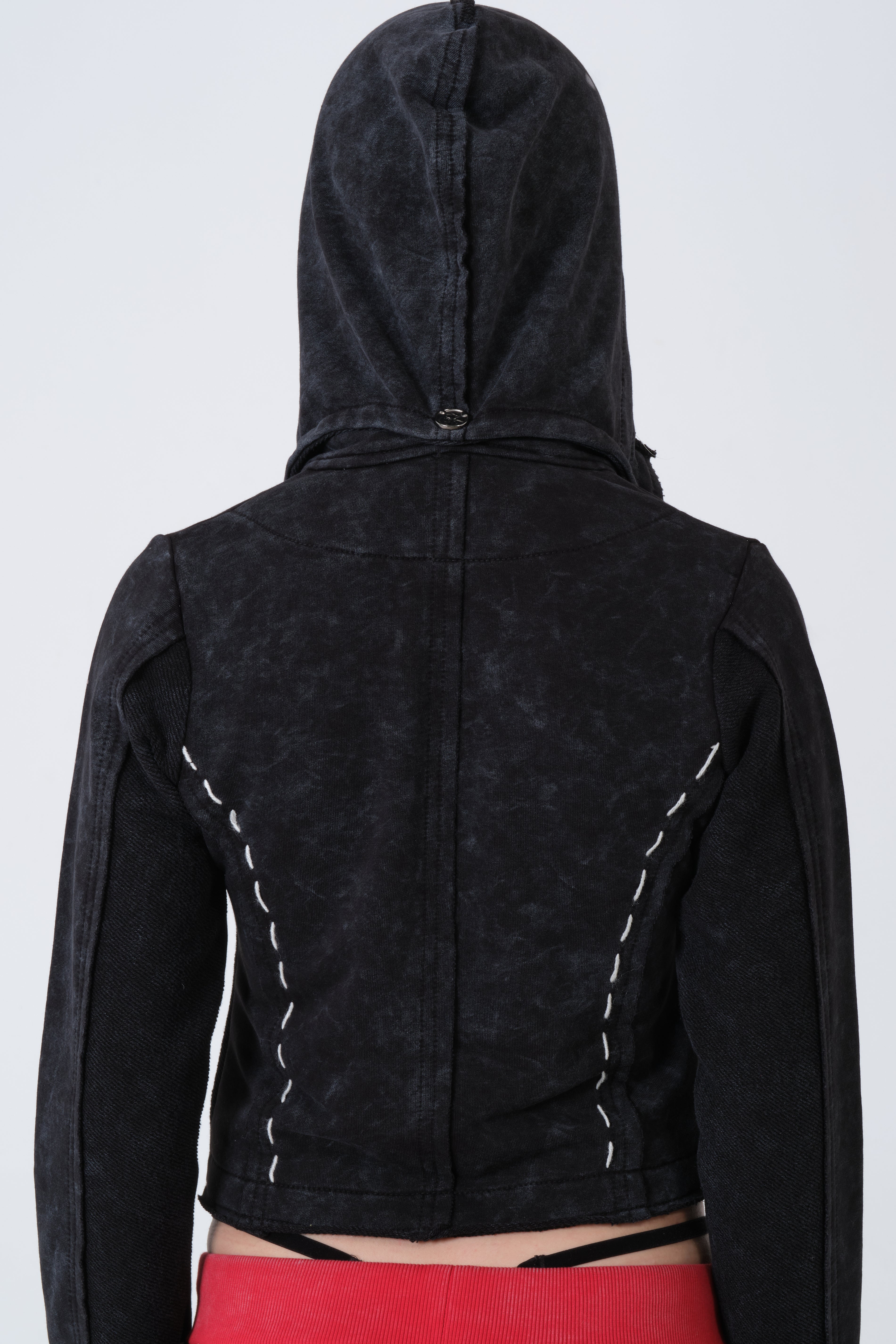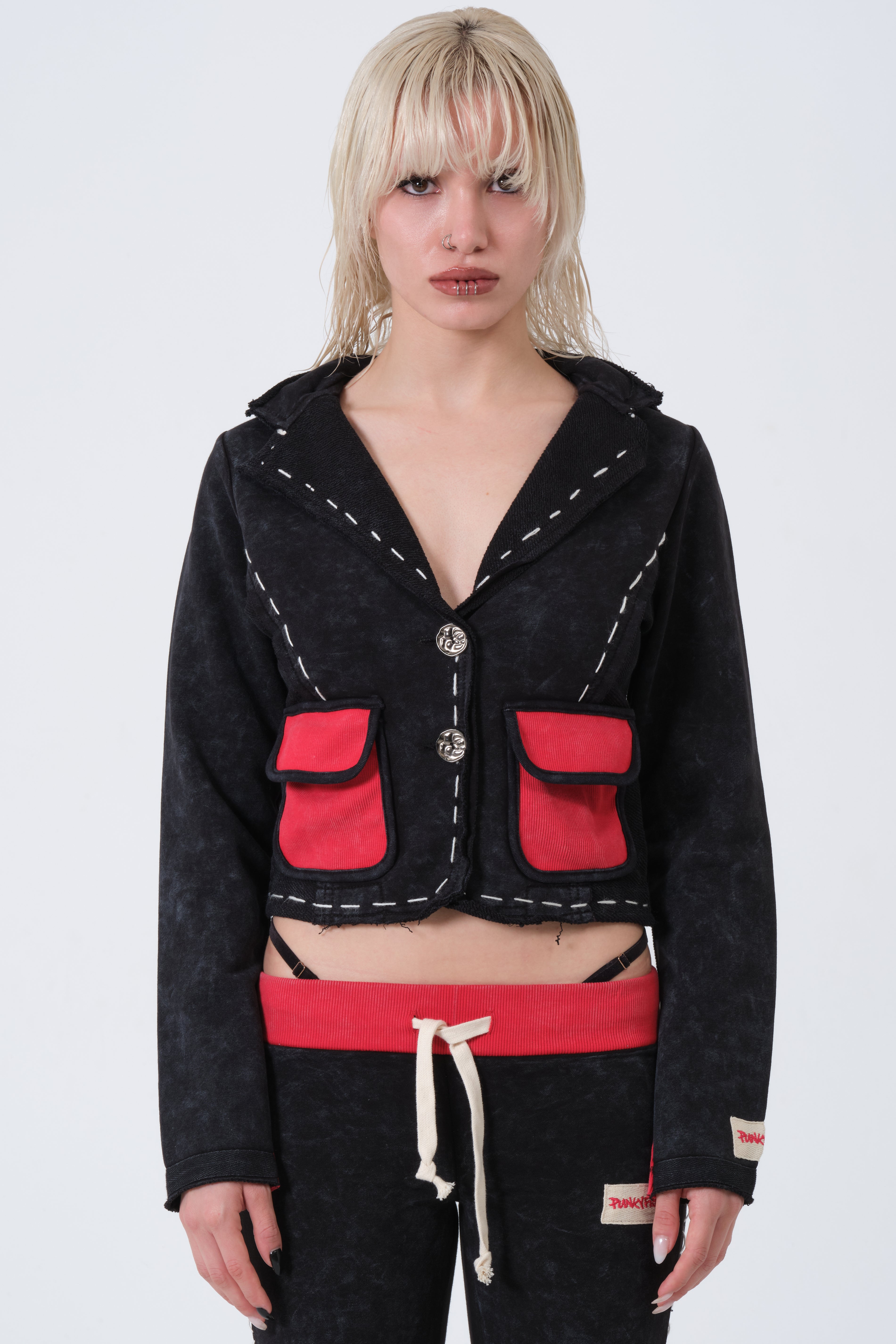 The Contrast Stitch Hooded Cropped Jacket blends punk tailoring with streetwear functionality. Crafted from a washed black fabric, it features the iconic white contrast stitching along the seams and spine. Bold Riot Red patchwork pockets add a striking pop of colour. The removable/integrated hood and cropped cut make it a versatile, edgy statement.