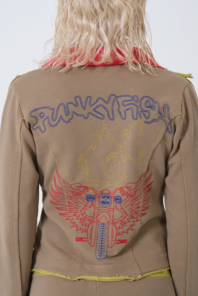 The Embroidered Toggle Front Jacket is a statement piece built for attitude. Crafted in a comfortable Khaki/Taupe knit, its structure is defined by the unique toggle strap closure and a bold deep V-neckline / wide collar. Bright Neon Green contrast trim on the collar and cuffs adds a vibrant pop. The back features a large, detailed Punkyfish logo and powerful wings with a mechanical engine motif embroidery, injecting a powerful, rock-inspired edge.