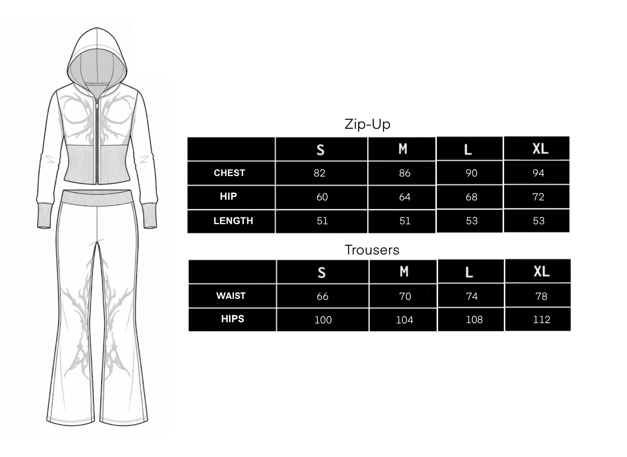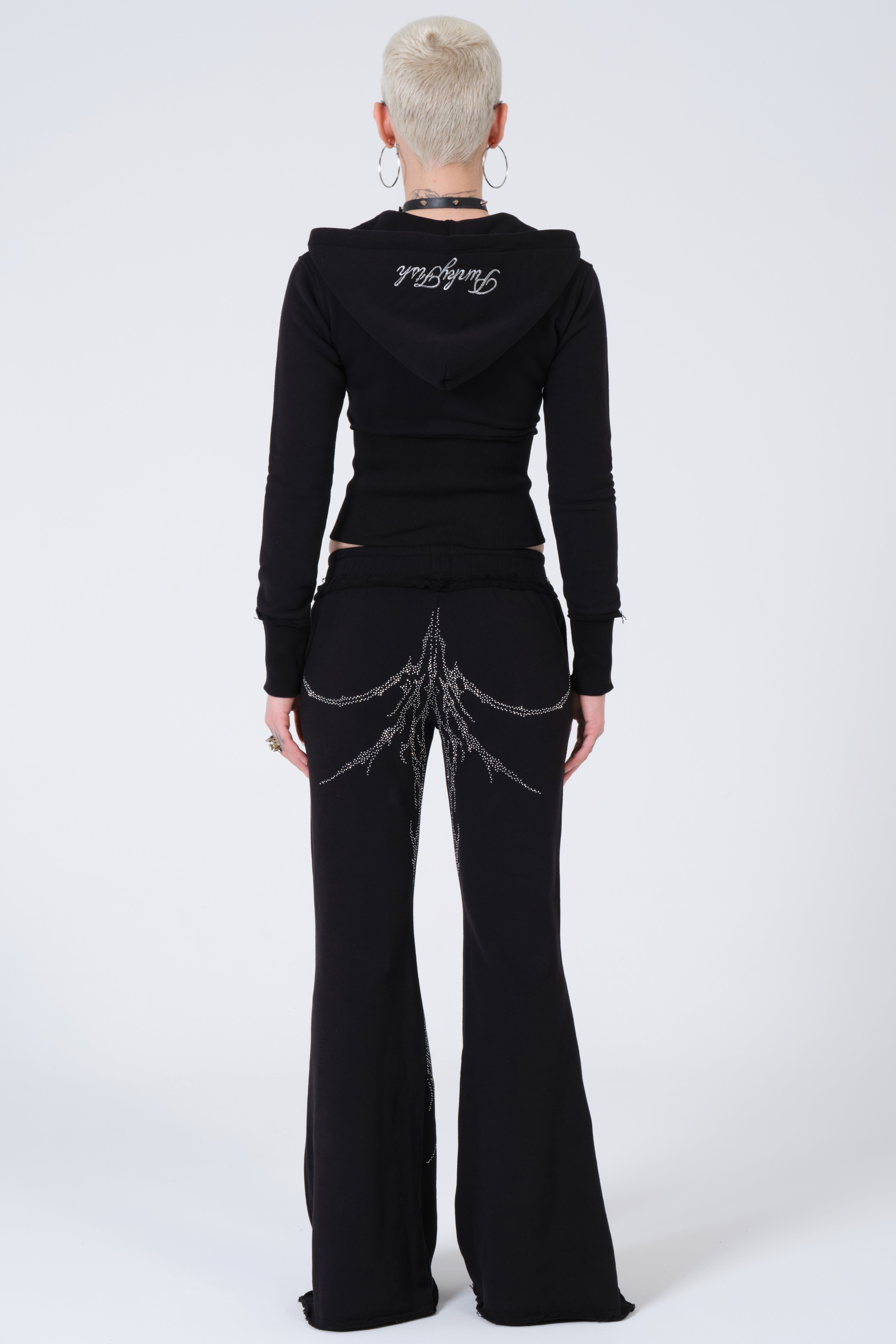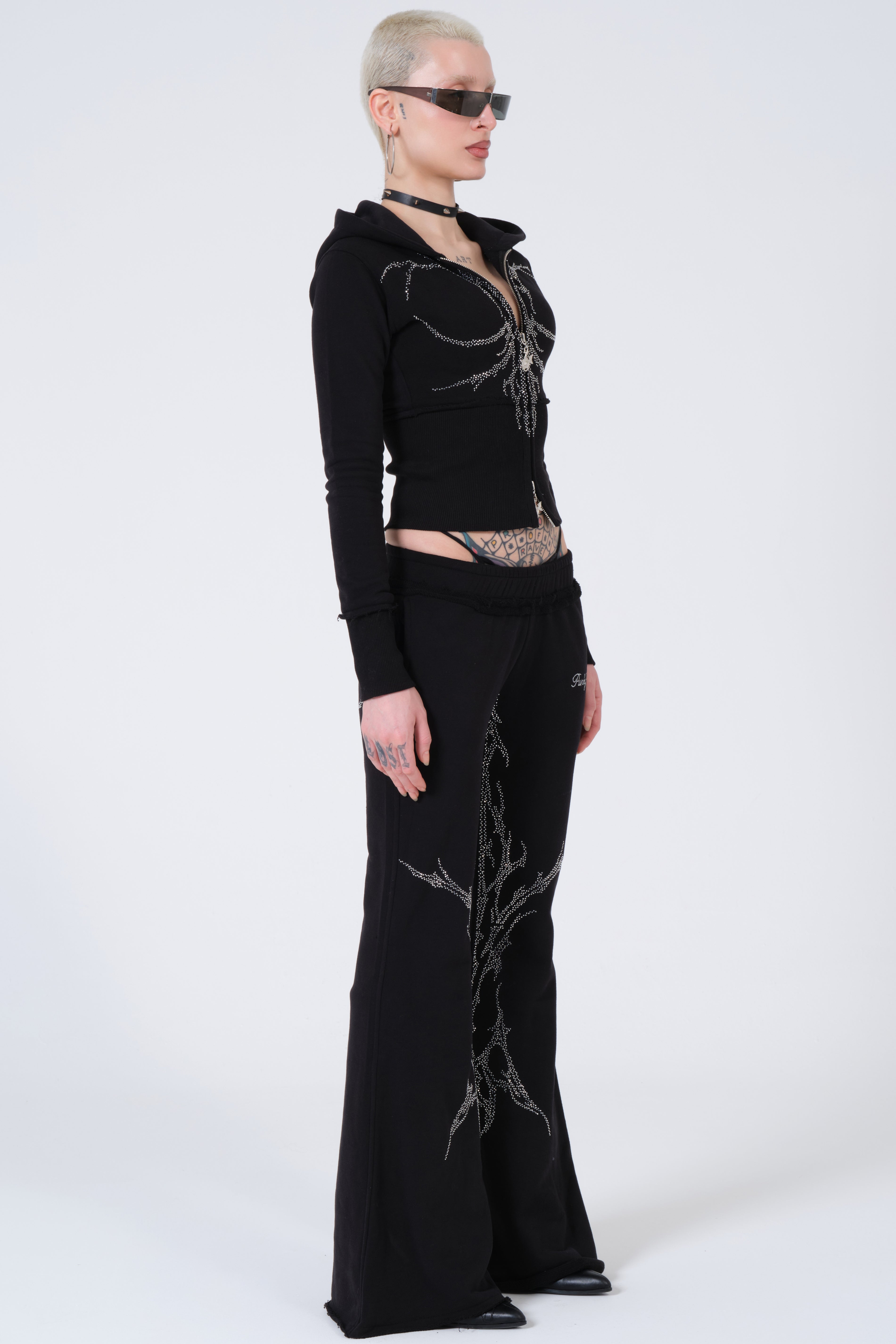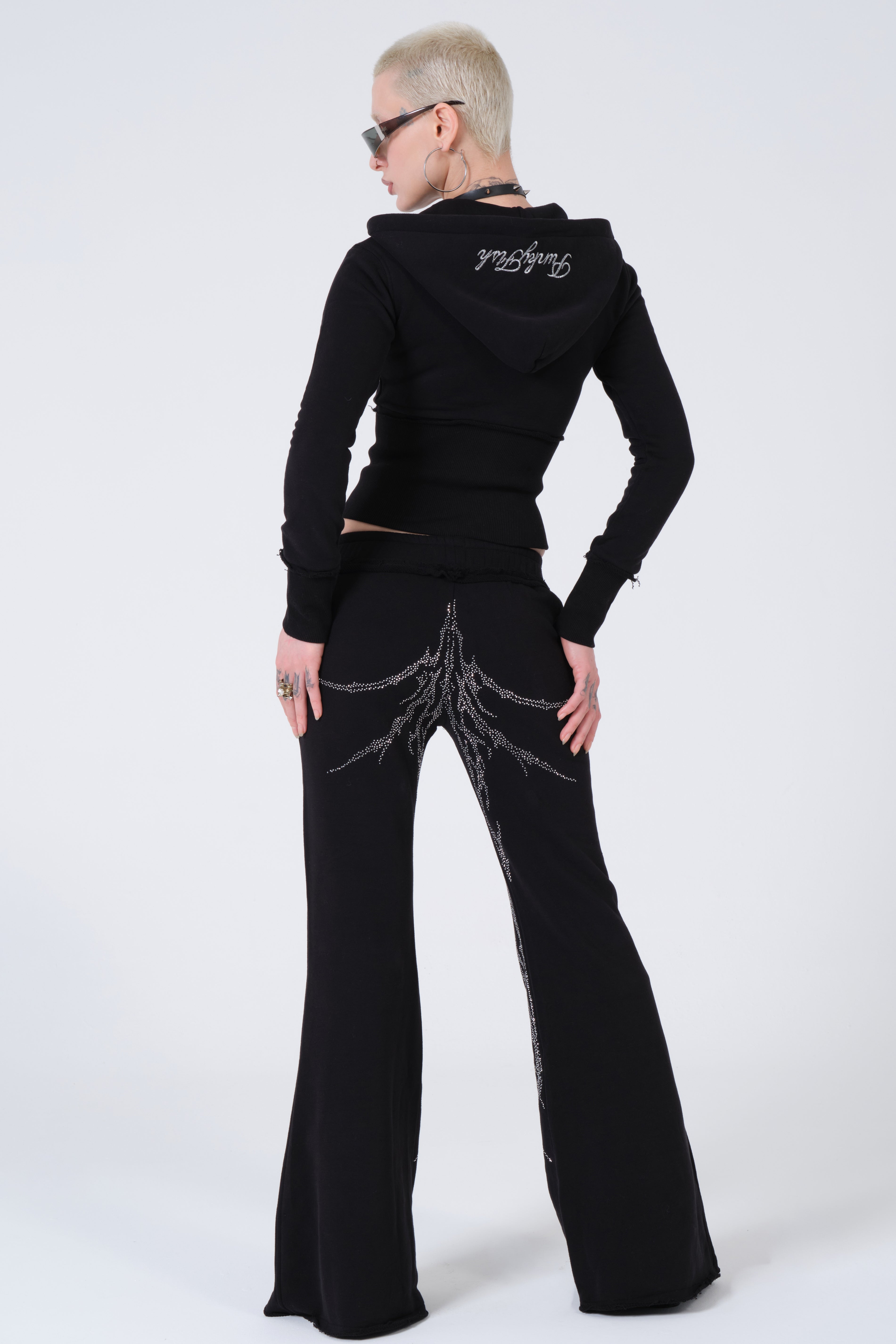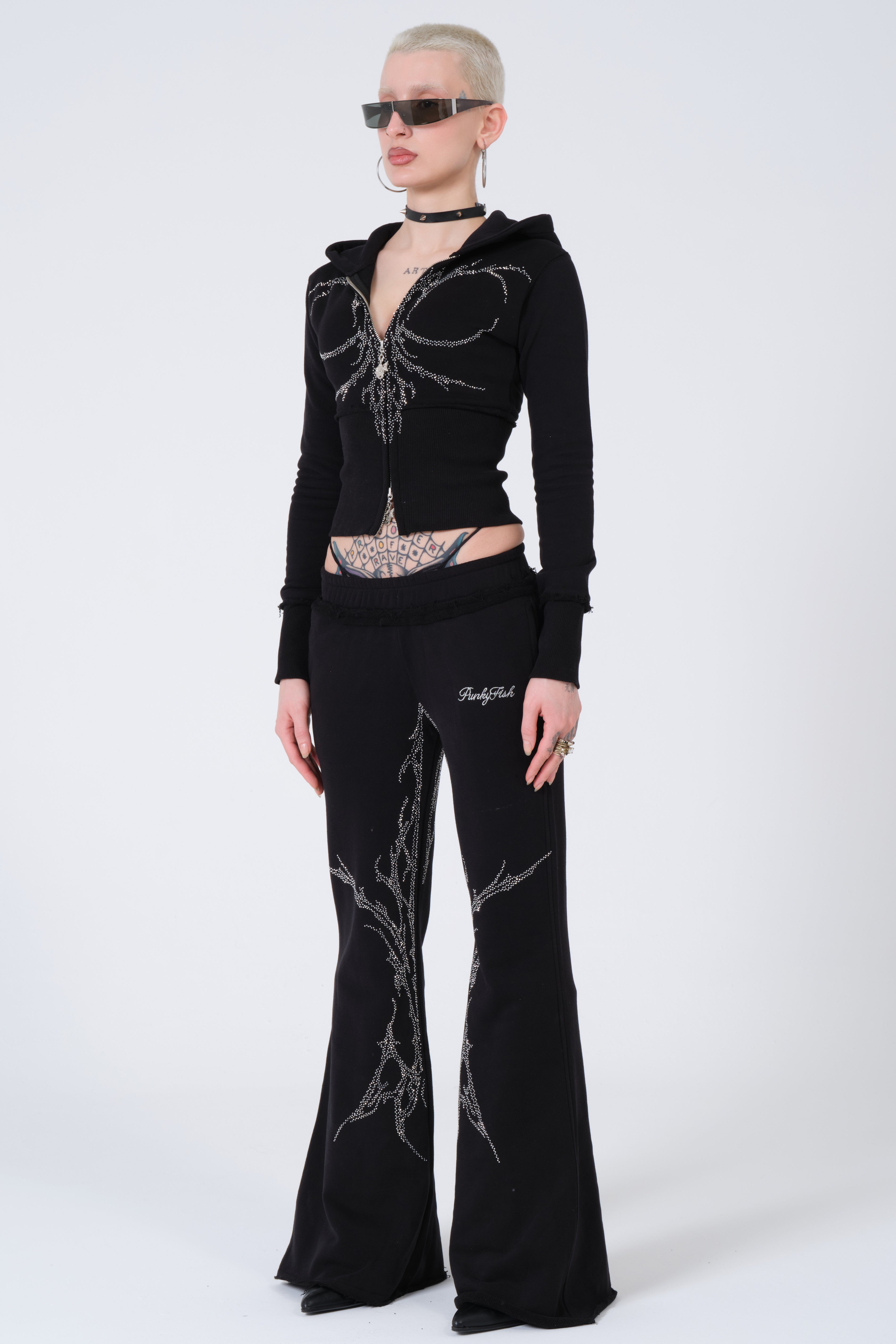 Punkyfish Gothic Crystal Embellished Co-ord Set – Distressed Slim-Fit Zip-Up & Low-Rise Flare Trousers